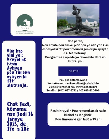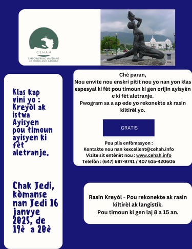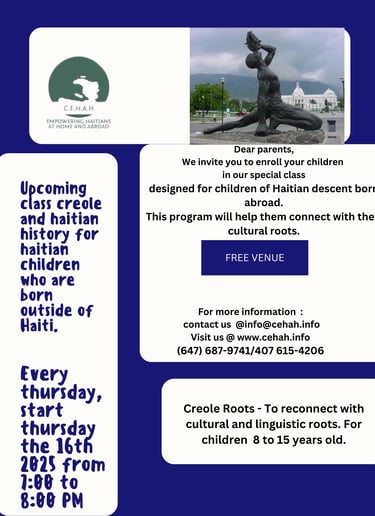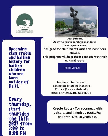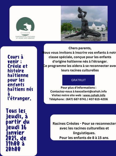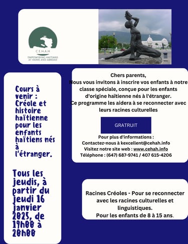 Offrez à vos enfants l'opportunité de se connecter à leurs racines culturelles et linguistiques grâce aux classes de créole et d'histoire haïtienne du CEHAH. Ces sessions éducatives leur permettront d'enrichir leur identité, de mieux comprendre l'histoire d'Haïti, et de parler fièrement notre belle langue.